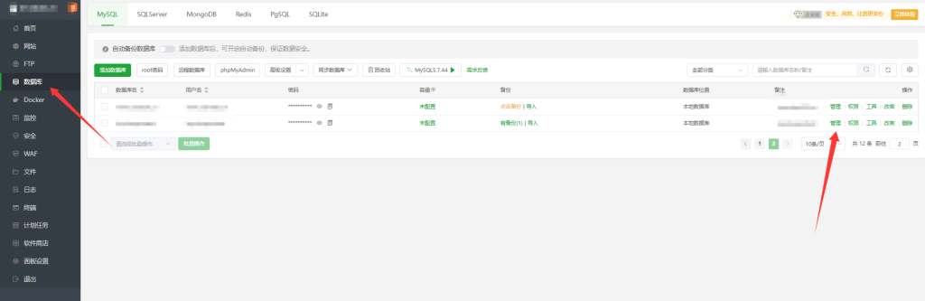 下一步我们登录智卡云所在的宝塔面板,然后进入数据库