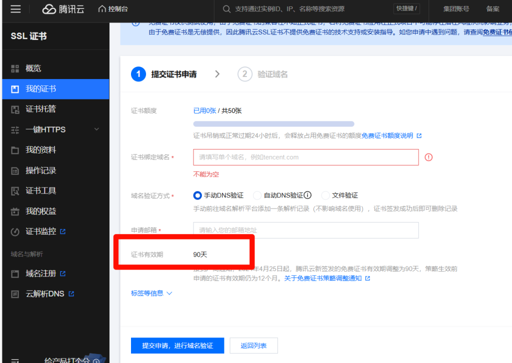 然后对ssl进行验证,这个验证是腾讯云需要确认你是该域名的主人