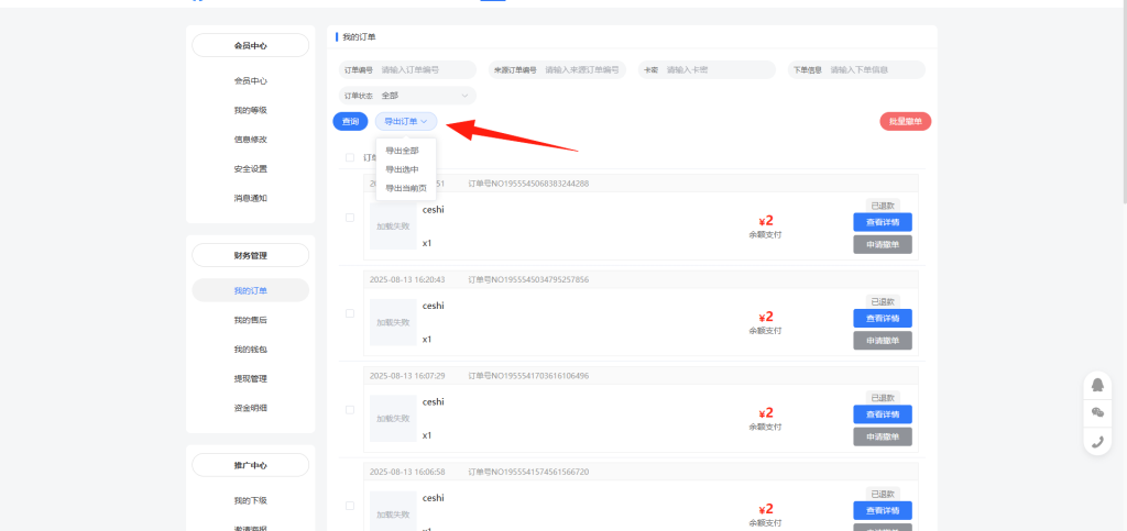 在订单中心点击导出订单,可以将订单以excel表格的形式导出