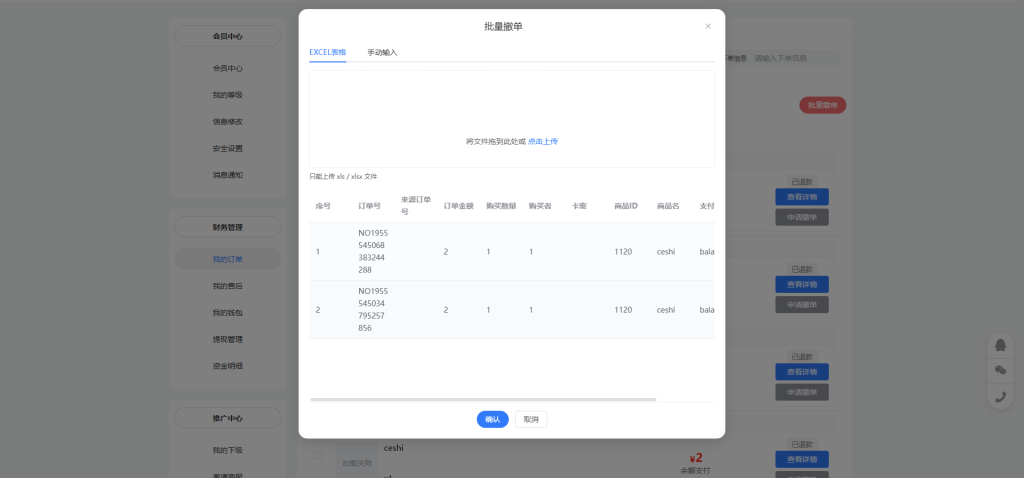 点击批量撤单可以将导出的excel表格拖入虚框内或者点击”点击上传”上传excel表格